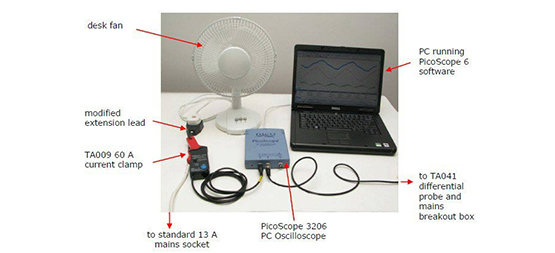 我們將風(fēng)扇插入改進(jìn)的延長(zhǎng)線,然后我們將其插入電源。然后我們打開電流鉗,按下“ZERO”按鈕并將其連接到延長(zhǎng)線上的帶電導(dǎo)體環(huán)。電流鉗的BNC引線連接到示波器上的通道A.