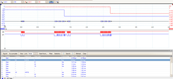 MSO有兩個(gè)模擬輸入通道,它們連接到Quad DAC的CH A和CH B輸出。該儀器還有16個(gè)數(shù)字輸入通道。在此應(yīng)用中,僅使用兩個(gè)數(shù)字輸入通道D0和D1,連接到SDA串行數(shù)據(jù)線和I2C總線的SCL串行時(shí)鐘線。