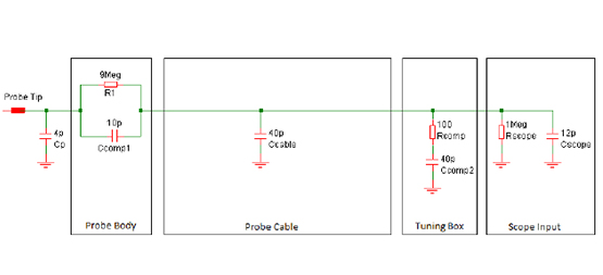 為了最大限度地減少被測(cè)設(shè)備的電容負(fù)載,大多數(shù)探頭使用x10(也稱為10:1)衰減器。這通常可以調(diào)整或補(bǔ)償,以改善頻率響應(yīng)。以下注釋說(shuō)明了使用兩個(gè)具有不同調(diào)整布置的示例探針的調(diào)整技術(shù)。