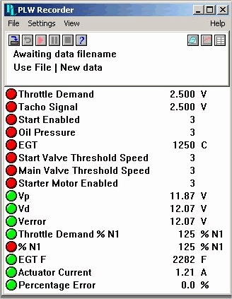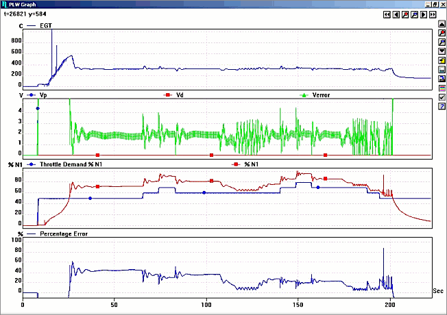 圖3:記錄的參數(shù) 使用PicoLog記錄以下引擎參數(shù): 節(jié)氣門需求 - 節(jié)氣門是一個(gè)電位計(jì),用于設(shè)定渦輪機(jī)的目標(biāo)速度。Pico數(shù)據(jù)記錄器直接記錄此電壓。渦輪機(jī)由PID控制器控制,以保持發(fā)電速度恒定,或者為發(fā)動(dòng)機(jī)起動(dòng)目的保持空氣輸送常數(shù)。 轉(zhuǎn)速計(jì)信號(hào) - 渦輪機(jī)配有磁力傳感器,通常位于減速箱中的某個(gè)位置,用于測(cè)量渦輪軸速度。這對(duì)于維持發(fā)動(dòng)機(jī)的壽命和安全性具有根本重要性(以及渦輪機(jī)入口溫度)。磁拾取器的輸出是脈沖序列; 將其轉(zhuǎn)換為電壓,然后由數(shù)據(jù)記錄器記錄。轉(zhuǎn)速計(jì)輸出對(duì)于表征渦輪機(jī)在加速度和負(fù)載下的動(dòng)態(tài)特性也是必不可少的,以便能夠建立PID控制器的初始增益常數(shù)。 啟動(dòng)已啟用 - 這只是在按下啟動(dòng)開(kāi)關(guān)時(shí)記錄,并充當(dāng)循環(huán)指示器的開(kāi)始。 油壓 - 一旦按下啟動(dòng)開(kāi)關(guān),渦輪機(jī)將通過(guò)其電動(dòng)啟動(dòng)馬達(dá)加速。在某些時(shí)候,渦輪機(jī)齒輪箱中的油泵將建立安全的最小油壓。這會(huì)關(guān)閉記錄的繼電器,并啟用點(diǎn)火。如果未建立油壓,則無(wú)法啟用點(diǎn)火。 EGT - 廢氣溫度。該參數(shù)使用排氣中的熱電偶測(cè)量。原始熱電偶電壓被放大和縮放以提供以攝氏度為單位的實(shí)時(shí)溫度顯示,并且還被記錄。溫度也是控制回路輸入之一,以防止突然的油門變化超過(guò)渦輪機(jī)限制。 啟動(dòng)閥門/主閥門閾值速度 - 當(dāng)發(fā)動(dòng)機(jī)在啟動(dòng)階段加速時(shí),檢測(cè)到增加的轉(zhuǎn)子速度,并且在各個(gè)階段,閥門自動(dòng)打開(kāi)以允許燃料進(jìn)入燃燒室。這有助于使渦輪機(jī)保持在其限制之下,即使PID控制回路可能要求最大加油。記錄這些速度閾值。 起動(dòng)電機(jī)啟用 - 在啟動(dòng)循環(huán)的加速階段的某個(gè)時(shí)刻,不再需要起動(dòng)電機(jī),并且斷電。此“速度閾值”也會(huì)被記錄。 Vp / Vd / Verror - 記錄比例和微分項(xiàng)的輸出信號(hào),以及循環(huán)誤差,以便確定系統(tǒng)的動(dòng)態(tài),優(yōu)化系統(tǒng)的穩(wěn)定性和瞬態(tài)響應(yīng)(不記錄積分項(xiàng))在這個(gè)特定的設(shè)置)。 節(jié)氣門需求%N1 - 在渦輪機(jī)應(yīng)用中,以最大額定軸速度的百分比表示轉(zhuǎn)子速度是方便和常規(guī)的。在多軸渦輪機(jī)中,將有多個(gè)'%N'指示,%N1%N2等。 %N1 - 實(shí)際轉(zhuǎn)子速度顯示為最大額定速度的百分比。 EGT F--由于渦輪機(jī)是美國(guó)的,而模擬儀表是華氏溫度,因此它顯示了華氏溫度下的廢氣溫度。 執(zhí)行器電流 - 燃料供應(yīng)由比例執(zhí)行器閥控制,該閥由電流控制。記錄執(zhí)行器電流以確定要測(cè)量的系統(tǒng)增益。 百分比誤差 - 節(jié)流閥需求與實(shí)際轉(zhuǎn)子轉(zhuǎn)速%N1之間的差異。例如,當(dāng)PID積分項(xiàng)接通時(shí),這很容易觀察到,并且誤差趨于零。