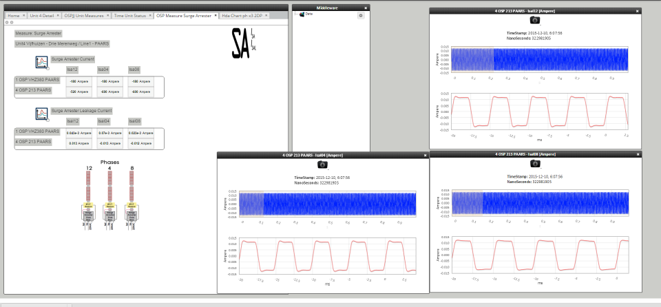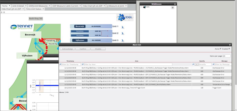 PCMONS安裝在荷蘭北部40公里的高壓電網(wǎng)中,分布在8個(gè)單元中,覆蓋13個(gè)地點(diǎn)和4個(gè)變電站。它由連接到主機(jī)放大器的機(jī)柜,Pico Technology的采集儀器和觸發(fā)邏輯組成。機(jī)柜通過(guò)光纖連接到每個(gè)單元的一個(gè)服務(wù)器,其中觸發(fā)信號(hào)被分配并且數(shù)據(jù)被收集并傳輸?shù)街醒雴卧_@是使用專有人機(jī)界面(HMI)軟件Techimp TiSCADA存儲(chǔ)數(shù)據(jù)進(jìn)行可視化和分析的中央服務(wù)器。
