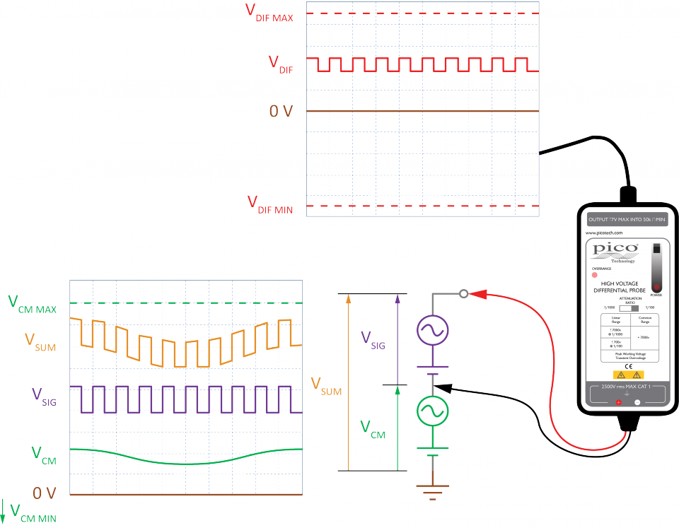 浮動到安全 那么解決方案是什么?如何在這些條件下使用示波器安全地進行電壓測量? 答案在于消除通往地面的道路。圖1顯示了一個簡化的差分輸入級(右側)。輸入“浮動”,確保探針之間的任何電位差都是可測量的。由于沒有低阻抗接地路徑,因此不可能出現短路。 在標準范圍內模擬差分測量的最簡單方法可能是利用示波器的數學函數。這些可以應用于通道對。將SE探頭連接到兩個通道(比如通道1和2),然后將它們的接地夾短接在一起,同時確保它們在被測設備(DUT)附近不會偏離。你仍然需要避免潛在的短褲!最后,通過從通道1中減去通道2,您將在屏幕上觀察到偽差分結果。 請注意,這是以丟失頻道為代價的!同樣不希望的是,該系統中的任何電壓誤差都是相加的 使用兩個通道進行單個偽差分測量意味著兩個誤差會逐漸增加 - 使其影響加倍。 傳統上,到目前為止,最優雅(但相當昂貴)的浮動輸入方式是購買差分探頭。真正的差分輸入級對于抑制兩個輸入端同時存在的電壓變化很有價值(稱為共模噪聲 - 圖中的V CM)。這是一個有價值的屬性,特別是在存在大量電噪聲的情況下探測敏感電路時 - 通常是電源和電機驅動器。圖2通過清晰的跡線(V SIG)說明了這種好處,即感興趣的信號,即使面對相當大的共模干擾,也顯示出穩定性。