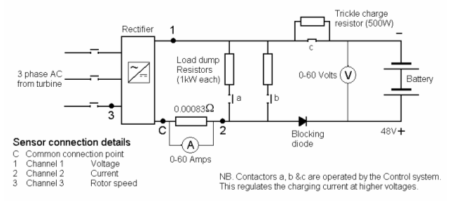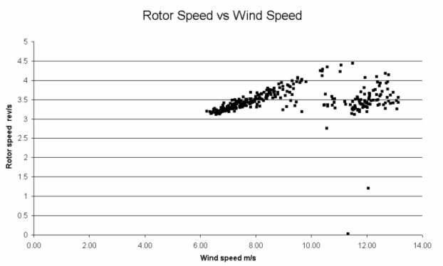測(cè)量條件 理想情況下,測(cè)試應(yīng)該應(yīng)用于驅(qū)動(dòng)恒定阻抗負(fù)載的風(fēng)力渦輪機(jī)。然而,這不是一個(gè)選擇,因?yàn)殡娏ο到y(tǒng)全面運(yùn)行,為農(nóng)場(chǎng)建筑和住宅提供真正的負(fù)荷。在測(cè)試期間,柴油發(fā)電機(jī)正在運(yùn)行供電并為電池充電。這有助于穩(wěn)定48伏直流電壓總線,并最大限度地減少瞬態(tài)負(fù)載沖擊,如果僅使用電池和風(fēng),則會(huì)改變負(fù)載阻抗并影響讀數(shù)。在測(cè)試過程中,Proven轉(zhuǎn)儲(chǔ)負(fù)載控制系統(tǒng)已停用。 主要測(cè)量值均在一天內(nèi)風(fēng)速從13米/秒穩(wěn)步下降至6米/秒時(shí)進(jìn)行。PicoLog軟件在記錄間隔中允許一定的寬容度,但通常每秒讀取所有四個(gè)參數(shù)并以500秒的塊記錄。當(dāng)風(fēng)速計(jì)固定在輕便的便攜式伸縮式桅桿上時(shí),如果風(fēng)改變,可以改變風(fēng)速計(jì)的位置以保持相對(duì)位置。