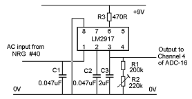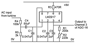 通道3 - 渦輪轉(zhuǎn)速 這是從風(fēng)力渦輪機(jī)整流器的三相輸入的一相導(dǎo)出的。在Proven控制面板內(nèi)與風(fēng)力渦輪機(jī)的AC線路的一相進(jìn)行物理連接。設(shè)計(jì)了一個(gè)分壓器,將峰值交流電壓降低到1.5到2伏特左右。由于這是頻率測(cè)量,因此電壓并不重要。圖2顯示了用于為ADC-16創(chuàng)建電壓的頻率到電壓轉(zhuǎn)換器。 第4頻道 - 風(fēng)速 使用的傳感器是NRG#40風(fēng)速計(jì)頭,一個(gè)行業(yè)標(biāo)準(zhǔn)單元。將其安裝在垂直于風(fēng)軸線的風(fēng)力渦輪機(jī)旁邊約5米的輪轂高度處。NRG#40使用小型永磁發(fā)電機(jī)產(chǎn)生交流信號(hào),其頻率與風(fēng)速成正比。使用頻率到電壓轉(zhuǎn)換器將風(fēng)速計(jì)AC輸出轉(zhuǎn)換為電壓(圖3)。