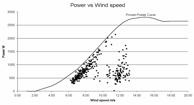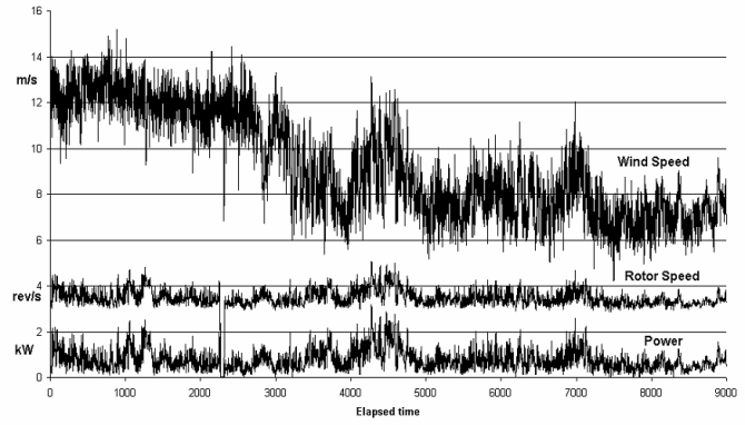 實(shí)地觀察 經(jīng)過驗(yàn)證的WT 2500風(fēng)力渦輪機(jī)經(jīng)過精心設(shè)計(jì),能夠承受相對(duì)較短的桅桿上的湍流區(qū)域中的惡劣條件,該桅桿比其他設(shè)計(jì)更接近地面。結(jié)果,它會(huì)遇到陣風(fēng)和風(fēng)向的快速但微小的變化,導(dǎo)致它在其偏航軸周圍顯著地連續(xù)加速,減速和振蕩。它很少以穩(wěn)定的速度直接指向風(fēng)。 在測(cè)試期間,注意到風(fēng)速計(jì)對(duì)風(fēng)的變化反應(yīng)非常快并且與方向無關(guān)。另一方面,風(fēng)力渦輪機(jī)的更大慣性將導(dǎo)致旋轉(zhuǎn)和偏航的響應(yīng)延遲。被動(dòng)葉片控制機(jī)構(gòu)本質(zhì)上也會(huì)略微落后于風(fēng)的變化。由于Zebedee鉸鏈的作用,旋轉(zhuǎn)速度和偏航方向引起的葉片角度的姿態(tài)意味著風(fēng)力渦輪機(jī)很少在實(shí)際操作條件下瞬間匹配理論最大發(fā)電值。這與風(fēng)洞測(cè)試形成鮮明對(duì)比,其中偏航和剪切風(fēng)不是問題,并且渦輪機(jī)有時(shí)間在負(fù)載或風(fēng)速的變化之間穩(wěn)定下來以呈現(xiàn)反映其最佳性能的穩(wěn)定讀數(shù)集。 高風(fēng)運(yùn)行 人們認(rèn)為風(fēng)力渦輪機(jī)在測(cè)試之前表現(xiàn)不佳,這些測(cè)試證明這是正確的。超過10米/秒的風(fēng)速產(chǎn)生了渦輪機(jī)的不穩(wěn)定功率輸出,遠(yuǎn)低于額定值。