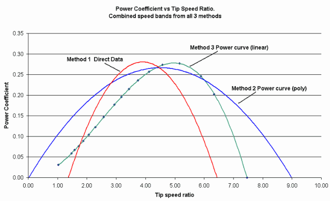 超過10米/秒,功率調(diào)節(jié)導(dǎo)致葉片錐形,記錄的早期數(shù)據(jù)不穩(wěn)定,使用這些數(shù)字會(huì)扭曲進(jìn)一步的數(shù)據(jù)處理。截止點(diǎn)設(shè)定為3500秒,在此點(diǎn)之前的讀數(shù)不用于詳細(xì)計(jì)算。由于白天風(fēng)速不低于6米/秒,調(diào)節(jié)速度為10米/秒,最終結(jié)果是基于3.1至4.4轉(zhuǎn)/秒的窄轉(zhuǎn)子轉(zhuǎn)速。 評(píng)估風(fēng)力渦輪機(jī)性能的通用標(biāo)準(zhǔn)是功率系數(shù)與尖端速度比性能曲線的關(guān)系圖。該曲線告訴您渦輪機(jī)如何有效地將風(fēng)能轉(zhuǎn)換為電能。使用各種方法繪制該曲線。結(jié)果顯示在下面的圖7中。