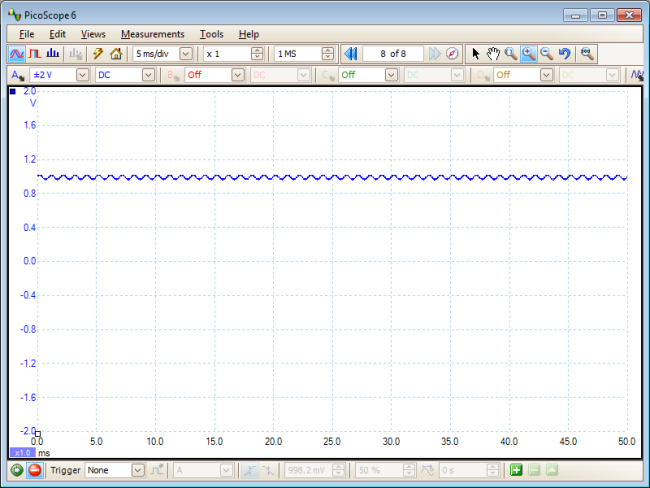 該信號現(xiàn)在占據(jù)總共400 mV的350 mV范圍,相當(dāng)于256個中的224個等級。因此,我們使用的是ADC的8位分辨率的log 224 / log2≈7.8位:超過3位以上之前。這使我們能夠以大約10倍的精度測量波形。
