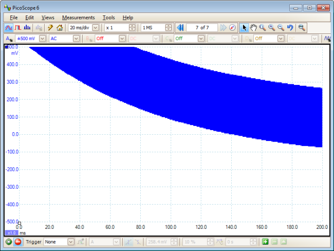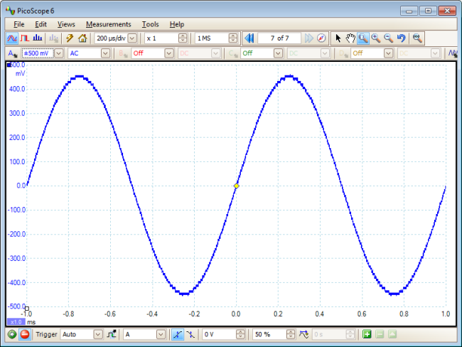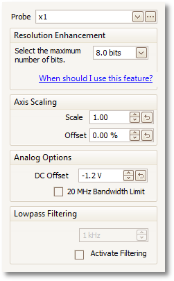 在PicoScope軟件中,每個通道的下拉菜單一目了然地顯示所有設(shè)置。我們將DC偏移設(shè)置為-1.2 V以取消輸入的共模電壓(圖6)。