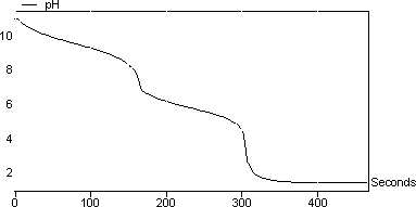 結果 圖2顯示了碳酸鈉與HCl的滴定曲線。曲線中有兩個突然的pH變化。這些對應于以下連續反應: Na 2 CO 3 + HCl - > NaHCO 3 + NaCl(碳酸鹽轉化為碳酸氫鹽) NaHCO 3 + HCl - > CO 2 + H 2 O + NaCl 在該實驗中計算的HCl的摩爾濃度為0.95mol / l。