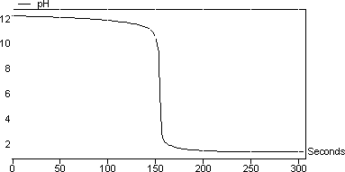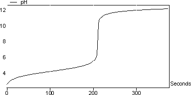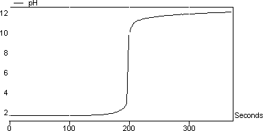 圖3顯示了反應的滴定曲線: NaOH + HCl→> NaCl + H 2 O. 該反應涉及強酸(HCl)和強堿(NaOH)。您可以注意到pH值從非常高的pH值變為非常低的pH值。在此類反應中,等當點的pH值為7.將光標移動到屏幕上,看到最陡的痕跡發生在pH 7 在該實驗中計算的NaOH的摩爾濃度為1.01mol / l。