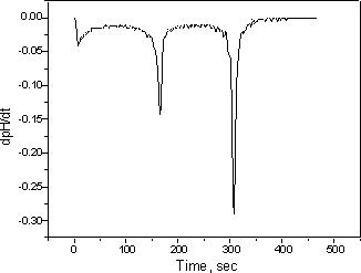 進一步研究 1.重復第3部分,用HCl和NaOH的濃度減少10和100倍。研究濃度對pH變化的影響。 2.用H 3 PO 4代替HCl 重復第6部分。(你應該看到一條上升的曲線,其中兩個pH值跳躍對應于磷酸的前兩個氫原子) 3.繪制所有先前實驗的時間的一階導數(dpH / dt),并在每種情況下找到終點。一階導數曲線中的終點定義為最大值處的點。可以通過繪制諸如MicroCal Origin之類的程序來獲得一階導數曲線。(樣本如圖7所示)