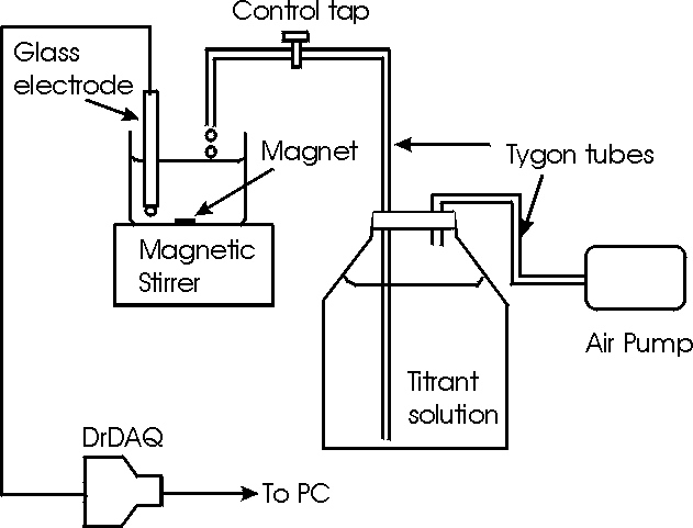 實驗設置 系統(tǒng)如圖1所示連接。空氣泵以固定且已知的流速推動滴定劑溶液: [滴定劑的體積(V)在時間(t)后加入=流速(mL / sec)*時間(t)(sec)] 通過這種方式,滴定劑的添加量成為時間的線性函數(shù),該變量可以用DrDAQ和PicoLog記錄。