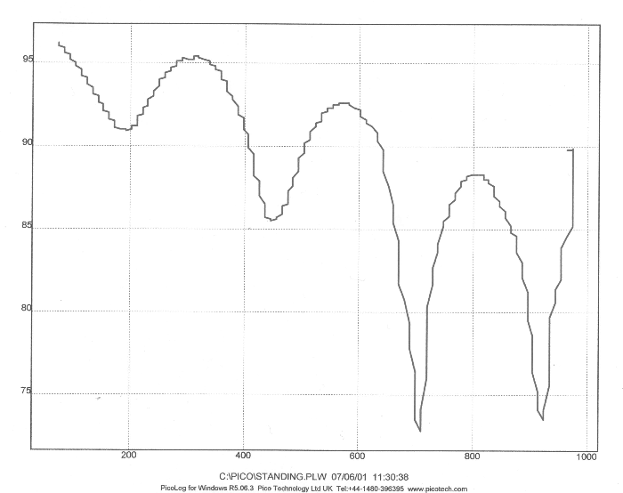 完成記錄后,選擇XY圖形以提供電壓(距離)與聲音強度的關系圖。使用您在設置階段讀取的讀數將電壓讀數縮放到距離。該圖應該看起來像圖中所示,節點和反節點清晰可見。