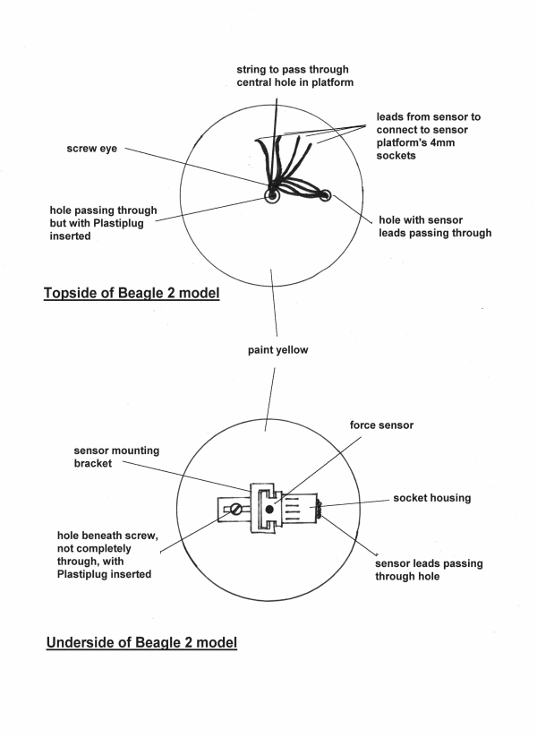技術(shù)人員的筆記 以下項(xiàng)目是構(gòu)建Beagle 2著陸器模型所必需的: 1力傳感器FSG15N1A(Farnel InOne 721-6671) 1個(gè)力傳感器安裝支架(Farnel InOne 721-6683) 塑料落水管(Marley 68 mm RPH252BX) Quickset水泥 2 4 mm插座紅色(JPR 705-230) 2 4 mm插座黑色(JPR 705-231) 1 1N4001二極管(JPR 1N4001) 1個(gè)PP3電池夾(JPR 440-006) 1 9 V PP3堿性電池* 1 4 mm插頭紅色(JPR 706-197) 1 4 mm插頭黑色(JPR 706-198) 1插座外殼4路(JPR 710-604) 壓接端子(JPR 710-660) 細(xì)連接線 小螺絲眼 小Plastiplug 毛圈夾適合PP3電池 為了適應(yīng)反擊攤位老板而不斷推銷 薄木或塑料桿固定繩 苯乙烯板材2毫米* 10厘米* 10厘米(W愛好或當(dāng)?shù)啬P偷辏?/span> 串 螺絲 黃色油漆 *指定的電源電壓介于10 V dc和12 V dc之間,但發(fā)現(xiàn)9 V PP3堿性電池工作正常。