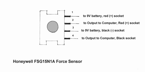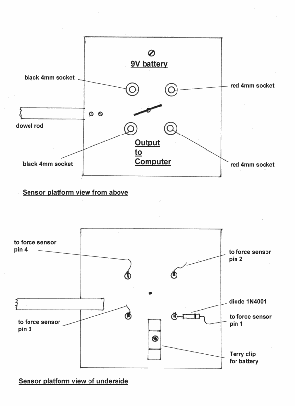 如上圖2所示構(gòu)建傳感器平臺(tái),并將引線焊接到相應(yīng)的插座,將1N4001二極管連接到9 V電池線,其帶(陰極端)距離紅色4 mm插槽最遠(yuǎn)。該二極管可防止與力傳感器的反向電池連接。下面的圖3顯示了與力傳感器的連接。