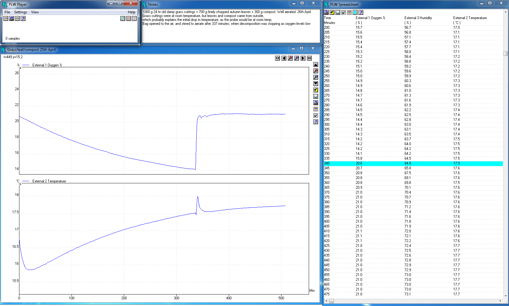 結(jié)果 該圖清楚地顯示溫度升高(下圖)和氧氣水平在密封的草屑中下降。隨著氧氣水平下降,溫度上升速度減慢,因此打開(kāi)袋子并攪拌草以引入更多氧氣。然后將袋子向空氣敞開(kāi)。這導(dǎo)致溫度短暫上升,然后下降,然后繼續(xù)緩慢上升。