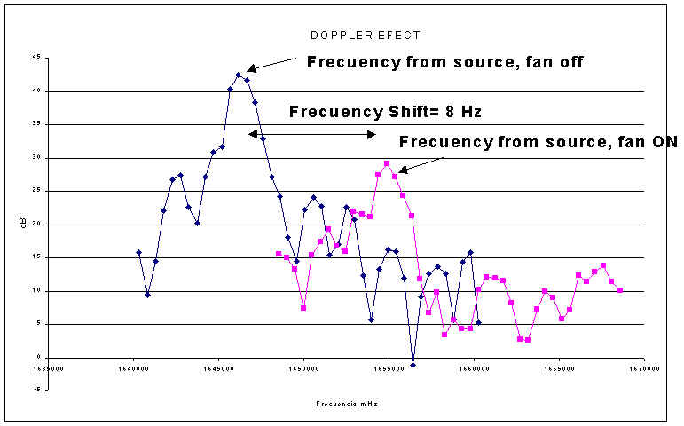 我們可以使用估計的空氣速度(6.0 kph)和保存的數(shù)據(jù)來驗證實驗生成的數(shù)據(jù)質(zhì)量,檢查全頻譜的頻率變化。 STEP1.txt 和 STEP2.TXT 我們將STEP1.TXT文件導(dǎo)入 Excel工作表并應(yīng)用多普勒效應(yīng)方程來計算低頻和高頻頻率的變化。將這些計算出的頻率與頻率進(jìn)行比較,STEP2.TXT我們將觀察到頻率(2-500Hz)的低中頻范圍內(nèi)的頻率(mHz)的低變化。我們繪制Excel工作表中的數(shù)據(jù),如圖3所示。
