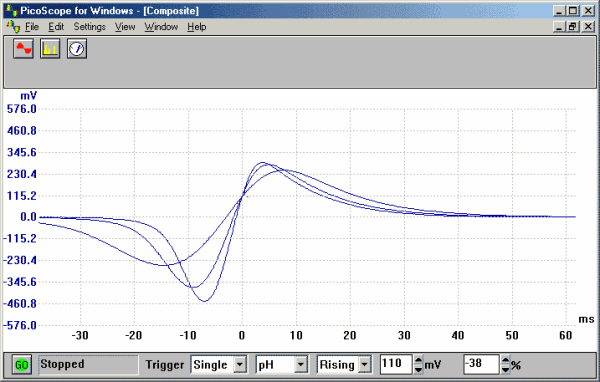 由此可以看出,改變管頂部和線圈之間的距離(如等式1中所示),磁體的速度將改變。 為了創建下面的顯示,我們從幾個不同的高度放下了磁鐵,并使用了PicoScope的復合視圖功能。