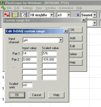 1.選擇文件>設(shè)置>自定義范圍 2.在自定義范圍列表中選擇添加 3.輸入圖所示的設(shè)置(圖2) 4.使用通道A的下拉菜單選擇pH,范圍為±576 mV 5.DrDAQ屏幕現(xiàn)在看起來(lái)應(yīng)該與圖3中顯示的圖像相同