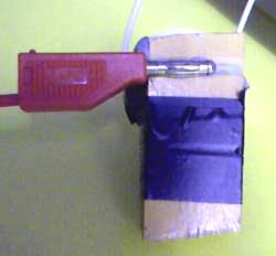 燈安裝在一小塊木頭上。將4mm插頭的裸端固定在木材的下側,并放在電位計線上。DrDAQ測量了電線的0伏端[燈的最近端]和4毫米插頭之間的pd。 在下面的照片中示出了燈和插頭在木頭上的布置的細節。