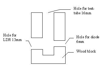 傳感器組件 木塊約10厘米×5厘米×5厘米 LDR(Maplin零件號HB10L) LED(Maplin零件號NP03D) 2個電阻(330歐姆和3.9歐姆) 9伏電池 雜物(電線,焊料,膠帶)