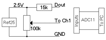 100k線性電位器 2.5 V基準電壓 - 使用Ref25分流基準電壓源。 高速數據記錄器 - 使用ADC-11。 自制擺系統。 該電路的結構如下圖所示 - 最大擺幅范圍內的電壓范圍為0至1.2 V,其中0.6 V為中心靜止位置