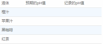 在開始實驗之前,制作一個表格,列出您將要測試的飲料,并指出您對每種飲料的pH值的預期。 創建表格如下所示: