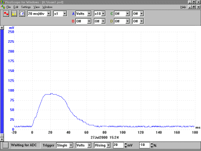 第3節(jié):找到碰撞動量的變化 脈沖,以及發(fā)生的動量的總變化,由電壓(力)下的面積 - 時間軌跡高于基線電壓表示。首先根據(jù)占用的小方塊數(shù)計算出來。在圖36.3中的區(qū)域A所示的位置(如上圖所示),方格數(shù)為459。 現(xiàn)在計算每個方格表示的脈沖或動量變化有多大。計算標記為B(150至250 mV)x(-20至0 ms)區(qū)域內(nèi)方格紙上的方塊數(shù)。在圖36.4中,它是145.100mV表示4.67N的力,因此該正方形數(shù)表示(4.67N×20ms)或0.0930Ns或0.0930kgm·s -1的脈沖或動量變化。因此每個方塊代表0.0930 kg m·s -1 / 145或0.000641 kg·m·s -1 和痕量區(qū)域(0.000641 kg ms-1 459)或0.294 kg ms-1。 現(xiàn)在計算每個方格表示的脈沖或動量變化有多大。計算標記為B(150至250 mV)X(-20至0 ms)區(qū)域內(nèi)方格紙上的方塊數(shù)。在圖36.4中,它是145. 100 mV表示4.67 N的力,因此該平方數(shù)表示(4.67 N x 20 ms)或0.0930 N·s或0.0930 kg·ms -1的脈沖或動量變化。因此,每個方格代表0.0930 kg·ms -1 / 145或0.000641 kg·m·s -1, 并且跡線的面積(0.000641 kg·m·s -1 459)或0.294 kg·m·s -1。