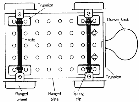 制作馬車 Meccano零件: 法蘭盤11孔5孔(1)Frizinghall MO52 耳軸(5)Frizinghall M126 法蘭輪(4)Frizinghall MO20 軸長200毫米(鋸成兩個)Frizinghall MO13A / R. 彈簧夾金屬(4)Frizinghall MO35 螺栓6毫米奶酪頭鋅(6)Frizinghall MO37B / CZ 堅果六角形鋅(6)Frizinghall MO37C 平頭螺釘4毫米開槽(4)Frizinghall MO69A 木制抽屜旋鈕,例如B和Q Sml Mush Knob RD509 在使用前,需要用金剛砂布清潔貨車車輪和軌道之間的接觸面。清潔輪軸的平頭螺釘接觸的軸桿也是明智之舉。