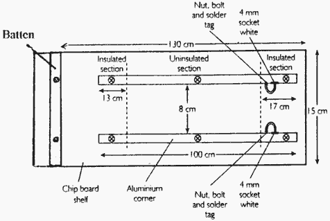 用于制作坡道 刨花板架150毫米x 1.5米DIY 木制面料25毫米x 25毫米x 150毫米DIY 鋁角15 mm x 15 mm x 1 mm x 1 m(2)B和Q. 刨花板螺絲(6) 沉頭螺釘1.5(2) 4毫米插座白色(2)JPR 705-210 螺栓(2) 堅果(2) 焊錫標簽(2) 連接線 PVC膠帶 砂布 鋁制角落經(jīng)過陽極氧化處理,因此整個區(qū)域都有非導(dǎo)電涂層。如圖T36.2所示,以及螺母,螺栓和焊料連接處,需要將其拆下。用砂布去除涂層。將PVC膠帶放在要保持絕緣的鋁材上。