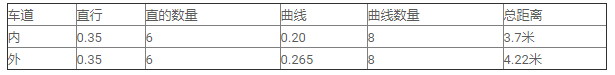 使用上述部分的賽車是不公平的,因?yàn)闆]有使用交叉部分,因此車輛必須行進(jìn)以完成一圈的距離具有超過半米的差異。下表顯示了使用的曲目: