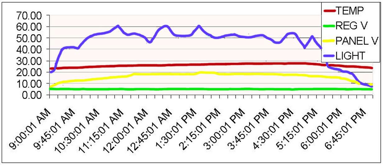 結果和答案 1.面板顯示由于溫度沒有輸出功率損耗。沒有跟蹤或監(jiān)控當天的環(huán)境溫度。 2.這個問題對所有人來說都是開放的。我沒有機會看到陰天會發(fā)生什么。我知道如果風刮過它就行不通。由于面板無法移動并撞擊限位開關,因此可能會燒壞電機。