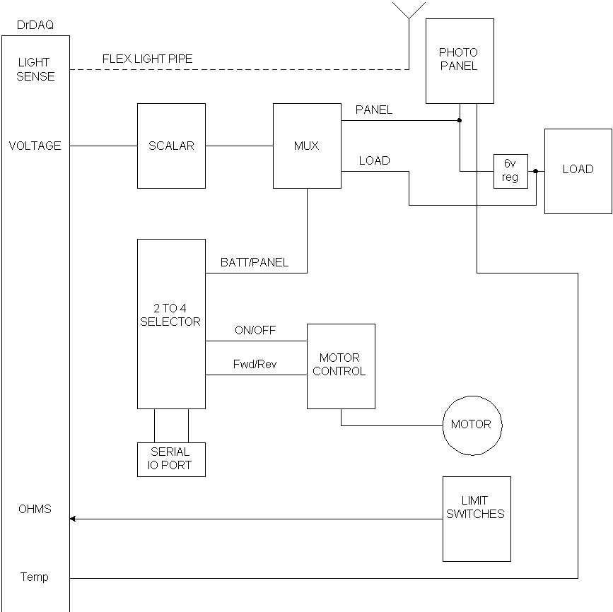 設置的特寫鏡頭。DrDAQ在左側的黑匣子中間,電子電機控制在中間,右側是串口到數(shù)字轉換器。