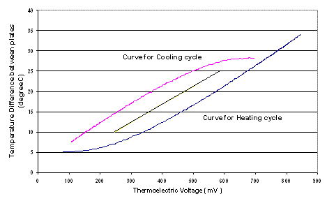 很明顯,溫度傳感器不能充分跟蹤板的實際溫度,但建議從加熱和冷卻曲線中取出電壓。從這些數(shù)據(jù)值生成中心放置的曲線,可以看出是一個很好的直線圖。梯度的倒數(shù)產(chǎn)生22.5±0.5 mV /°C的輸出,這接近于制造商對于典型電池的每°C 2 mm的規(guī)格。(必須注意的是,此轉(zhuǎn)換參數(shù)確實與模塊的工作溫度略有不同。但是,在50度左右的溫度范圍內(nèi),變化只會是百分之幾。) 理想的電壓發(fā)生器應(yīng)具有低內(nèi)阻,以便在負(fù)載電阻連接到輸出時提供顯著的功率輸出。發(fā)現(xiàn)內(nèi)阻約為1.8歐姆。制造商給出的值是1.5歐姆,所以再次有合理的協(xié)議。