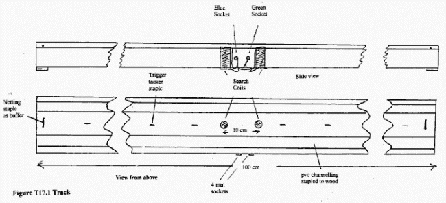 ?木材約120厘米×5厘米×2厘米 ?PVC溝槽高沖擊25 mm x 8 mm x 2 m B&Q ref:DGCH100 / 2 ?4毫米插座綠色JPR 705-232 ?4毫米插座藍色JPR 705-233 ?搜索線圈Maplin JC25C(2) ?連接線 ?橡膠腳JPR 885-060 ?金屬絲網(2) ?膠 使用釘槍固定通向木材的通道。將一個金屬絲網釘在兩端的“軌道”中間錘擊,作為停止。在通道中間鉆10個孔,在軌道中央10厘米處鉆一個孔,中心點每側5厘米。將搜索線圈粘貼到這些孔中,使其繞組在相同方向上,并且它們的頂部與通道的頂部表面齊平。在距離中心1.5厘米處的木材側面再鉆兩個孔。將兩個4毫米插座插入這些孔中。從木材底部再鉆兩個孔,使其與4 mm插座的焊接標簽接觸。將導線焊接到4 mm插座的焊接標簽上。將每個搜索線圈頂部的導線連接(通過焊接)到藍色插座的導線,以及從每個搜索線圈底部到綠色插座的電線的電線。將這些電線釘在木材的底部。