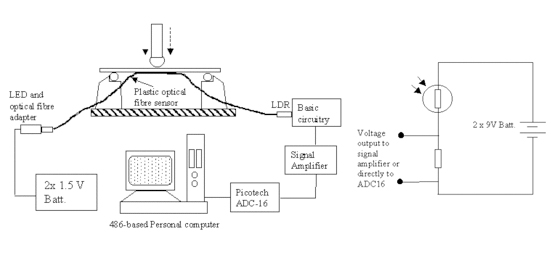 塑料光纖連接到(懸臂梁)上以監(jiān)測(cè)其偏轉(zhuǎn)。使用光敏電阻器(LDR)和基本分壓器電路監(jiān)測(cè)光纖光強(qiáng)度的變化。LDR的輸出由ADC-16連續(xù)測(cè)量