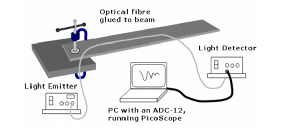 該實驗使用廉價的塑料光纖來測量懸臂梁的振動響應,其中質??量附著在自由端上。使用光檢測器監測通過光纖的光的調制。