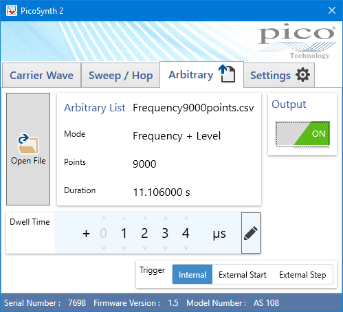 PicoSynth 2顯示文件內容摘要,以幫助您驗證是否已選擇正確的文件。您可以設置停留時間(點之間的時間)和觸發模式。