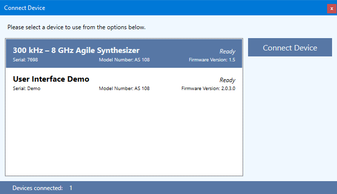 通過運行PicoSynth 2軟件的多個實例,您可以從一臺PC控制多個AS108信號合成器。每次啟動PicoSynth 2的新實例時,它都會列出所有尚未受控制的兼容連接設備。然后,您可以選擇列表中的任何設備進行連接。