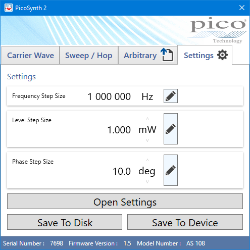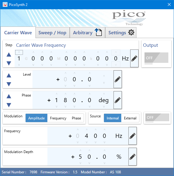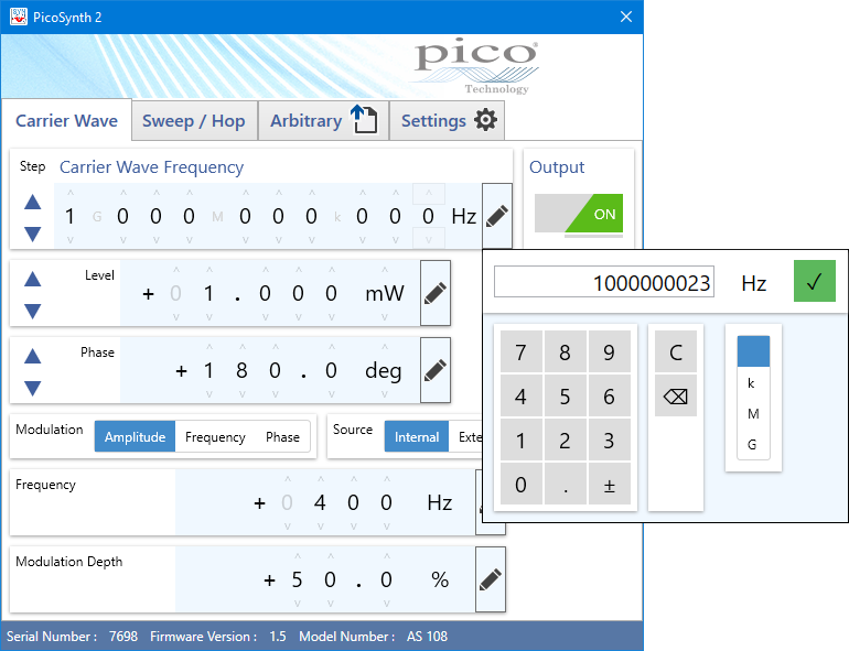 PicoSynth 2軟件提供了一個干凈,高效,觸摸屏兼容的用戶界面,可直接方便地訪問合成參數。這些可以通過可配置的增量值鍵入,滾動或步進,以可選擇的度量單位,例如dBm,mW,V RMS,V pk-pk或度和弧度。它的靈活性可以達到或超過臺式合成器的傳統控制面板。