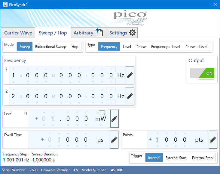 在兩個參數值之間設置掃描和跳躍:掃描開始和掃描結束(停止)。兩者都可以是更高的價值。設置掃描中的點數(2到10 001點之間)。然后,停留時間定義掃描中的每個點將被輸出的持續時間。PicoSynth計算并顯示整個掃描的持續時間和每個點之間的線性步長。雙向掃描將從開始掃描到停止并返回開始完成參數的單次掃描。跳是有限的掃描情況,其中只有兩個參數值交替輸出。