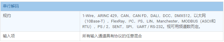 PicoScope 4000A系列具有標準的跨所有通道的串行解碼功能。PicoScope軟件可以解碼1-Wire,ARINC 429,CAN,DALI,DCC,DMX512,以太網10Base-T,FlexRay,I2C,I2S,LIN,Manchester,Modbus ASCII,Modbus RTU,PS / 2,SENT,SPI和UART協議數據為標準配置,正在開發更多協議,并在將來通過免費軟件升級提供這些協議。