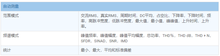 使用內置的測量統計信息,您可以查看每個測量的平均值,標準偏差,最大值和最小值以及實時值。您可以在每個視圖上根據需要添加任意數量的度量。每個測量都包括顯示其可變性的統計參數。有關示波器和光譜模式下可用測量的信息,請參閱“規格”表中的“自動測量” 。