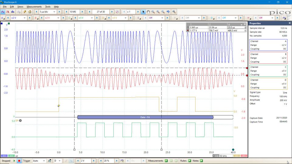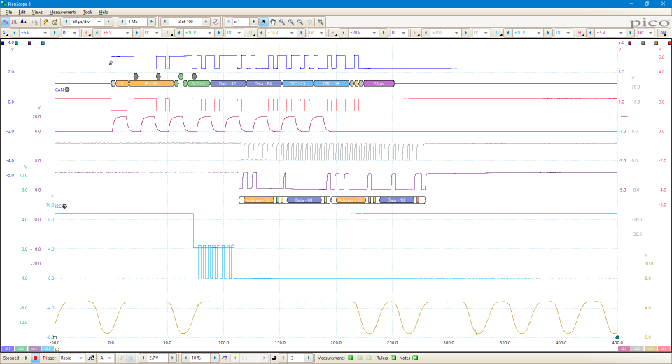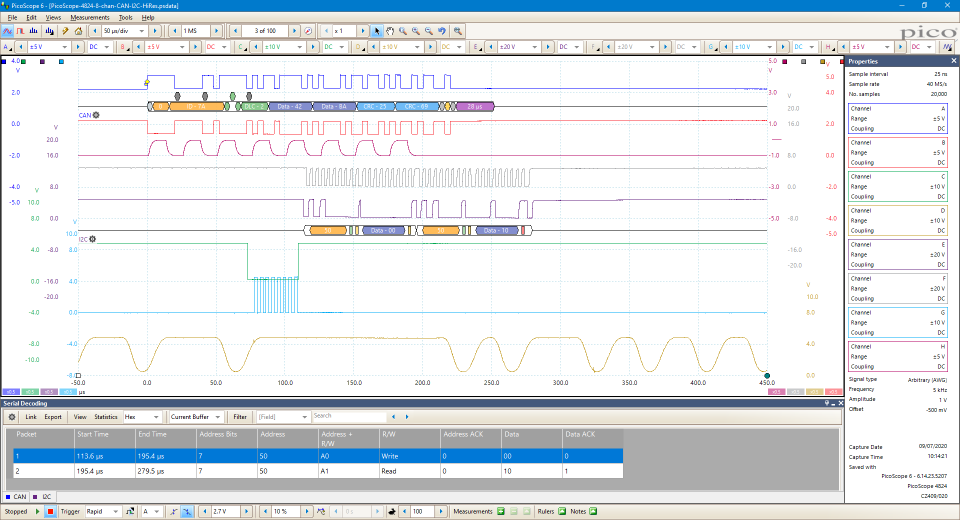 在調試具有示波器的嵌入式系統時,您可以快速用盡通道。您可能需要同時查看I 2 C或SPI總線以及多個電源軌,DAC輸出和邏輯信號。PicoScope 4000A系列最多具有八個通道,可以應對所有這些情況。選擇是解碼多達八個串行總線(同時可見模擬波形和解碼數據)還是串行總線與其他模擬或數字信號的組合。PicoScope在所有通道上都提供了高級觸發,因此您可以使用4輸入布爾邏輯觸發器來搜索欠幅脈沖,壓差和噪聲,以及查找數據模式。