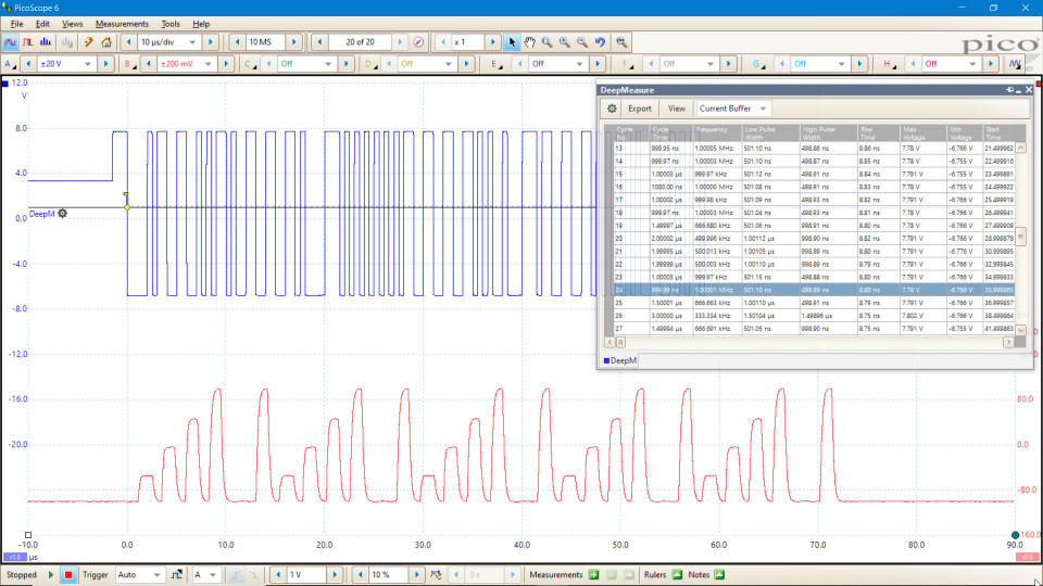 DeepMeasure可以自動測量重要的波形參數,例如脈沖寬度,上升時間和電壓。每個觸發的采集最多可顯示一百萬個周期。可以輕松地對結果進行分類,分析并將其與波形顯示相關聯。
