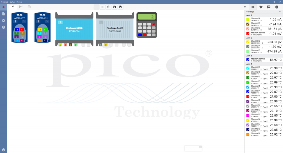 PicoLog 6允許每通道高達1 kS / s的采樣率,非常適合長期觀察多個通道上的常規參數,例如電壓或電流水平,而PicoScope 6軟件更適合用于波形或諧波分析。