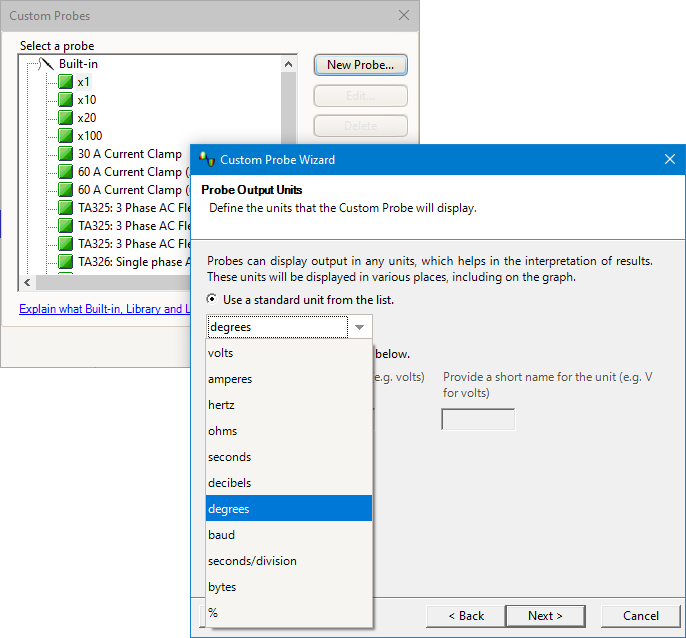 自定義探頭菜單允許您校正探頭和傳感器的增益,衰減,偏移和非線性,或轉換為不同的測量單位。內置了標準的Pico提供的探針的定義,您還可以使用線性縮放甚至是插值數據表創建自己的探針,并將其保存到磁盤以備后用。