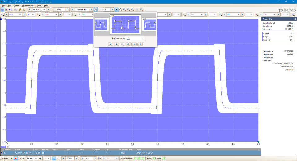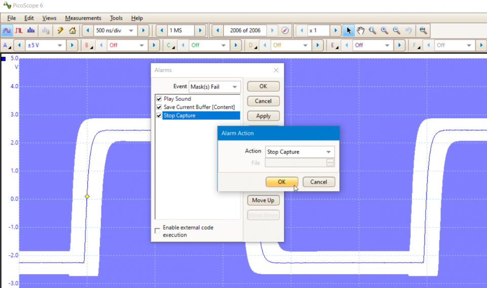 可以將PicoScope編程為在某些事件發生時執行操作。可以觸發警報的事件包括掩碼限制失敗,觸發事件和緩沖區已滿。PicoScope可以執行的動作包括保存文件,播放聲音,執行程序以及觸發信號發生器或AWG。警報以及模板極限測試可幫助創建功能強大且節省時間的波形監視工具。捕獲已知的良好信號,在其周圍自動生成一個遮罩,然后使用警報自動保存任何不符合規格的波形(帶有時間/日期戳的波形)。