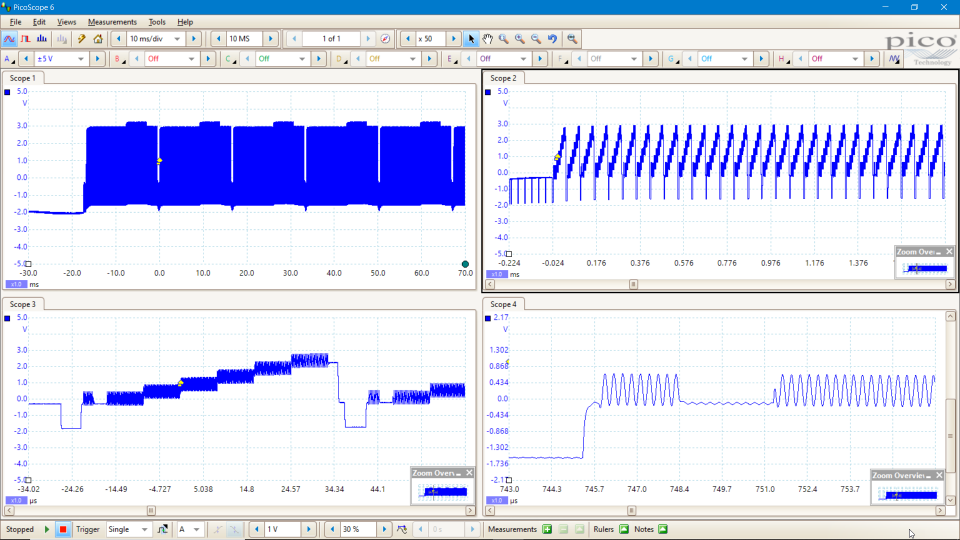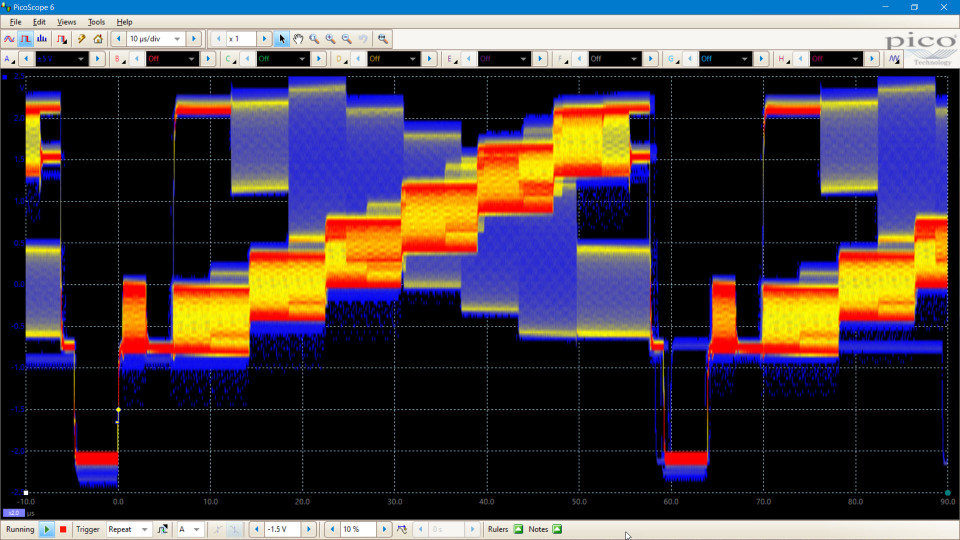 PicoScope 6軟件可以一次顯示多達16個示波器和光譜視圖,從而使比較和分析更加清晰。可以對分屏顯示進行自定義,以顯示所需的任何波形組合,以顯示同一信號的多個通道或不同變體。此外,所示的每個波形都可與單獨的縮放,平移和濾波器設置一起使用,以實現最大的靈活性。除了使用比固定示波器大很多倍的顯示器外,這些都是在傳統臺式機型上選擇USB示波器的進一步原因。