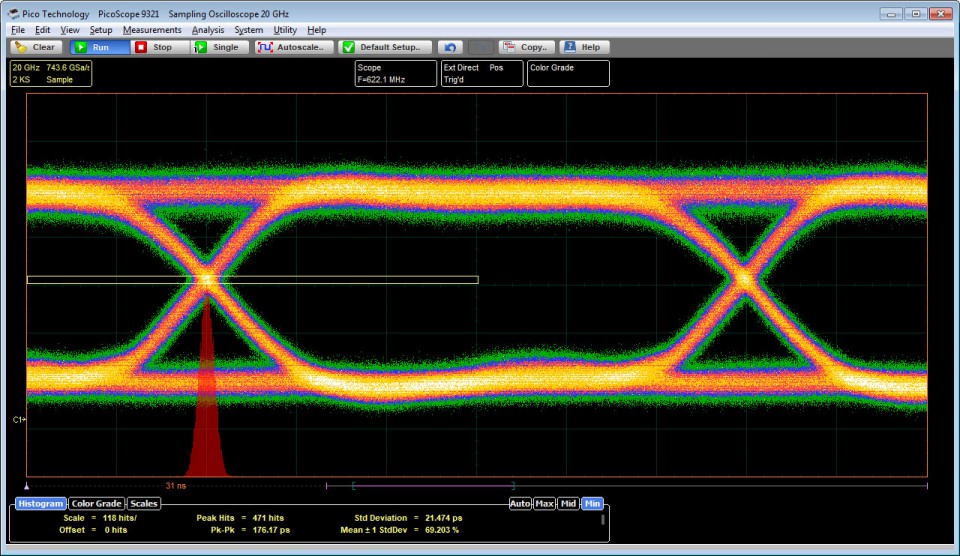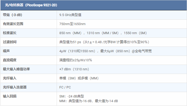 PicoScope 9321-20包含一個內置的精密光電轉換器。通過轉換器輸出連接到示波器輸入之一(可選擇通過SMA脈沖整形濾波器),PicoScope 9321-20可以分析標準光通信信號,如OC48 / STM16,4.250 Gb / s光纖通道和2xGB以太網。該示波器可以通過自動測量光學參數進行眼圖測量,包括消光比,S / N比,眼高和眼寬。憑借其集成的時鐘恢復模塊,示波器可用于11.3 Gb / s。